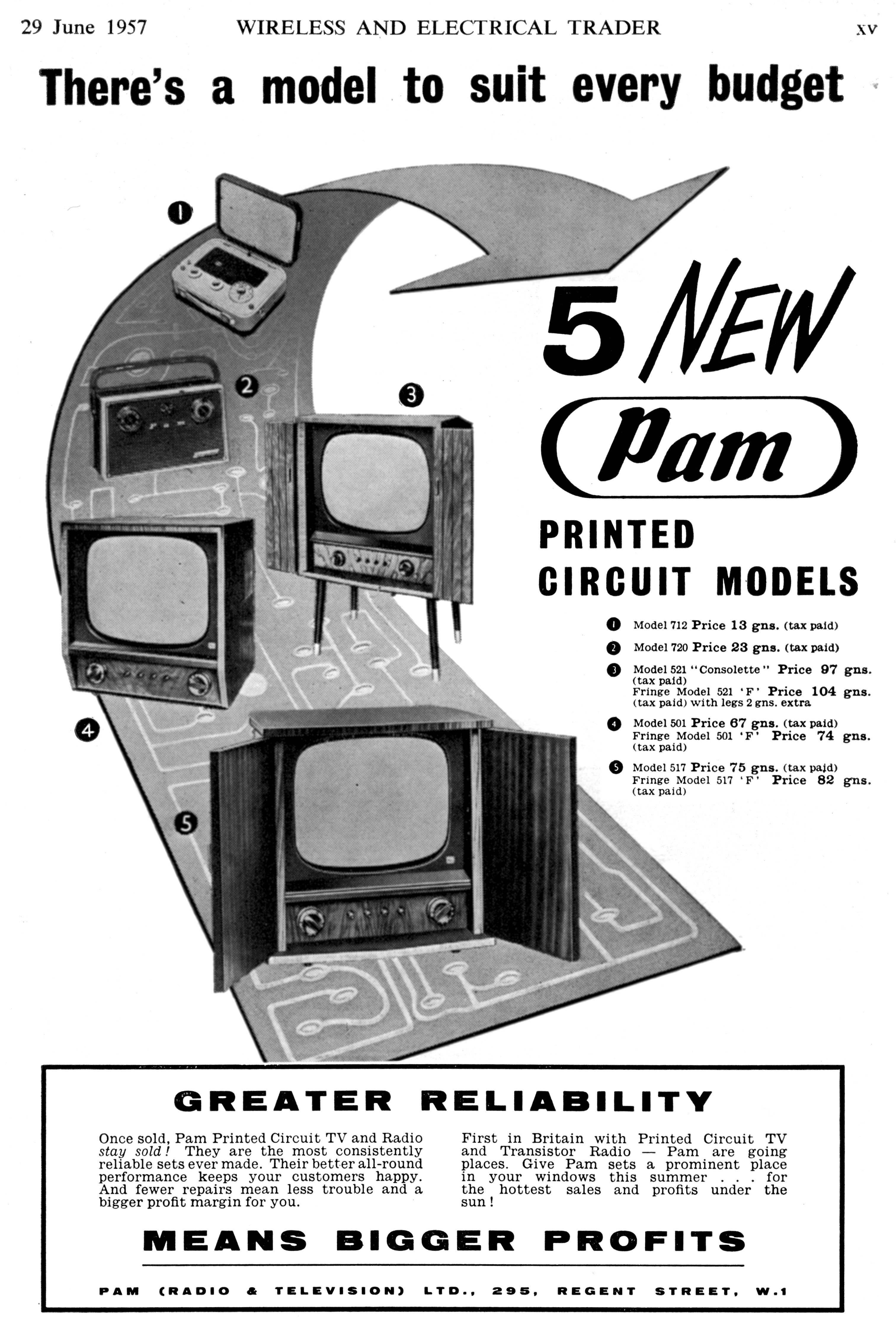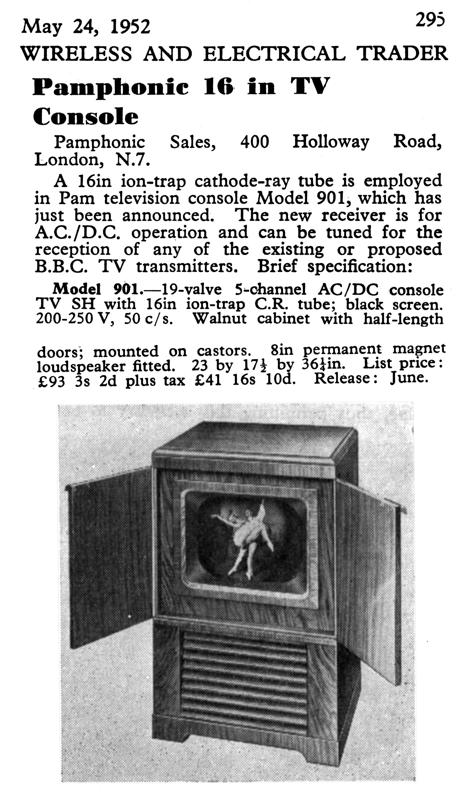 Pamphonic Televisions were made from about 1951. Initially they carried the original “Pamphonic” brand but about 1954 that changed to “Pam” and they stayed with Pam branding from there on. The links with Pye and the large model range suggests that the Pam range was heavily based on Pye chassis designs.